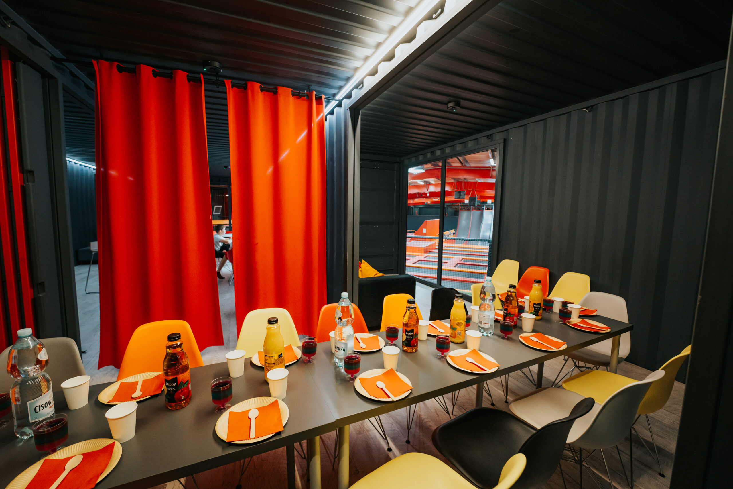 Dodatkowym plusem tej sali jest widok na halę z trampolinami – dzieci i rodzice mogą obserwować, co dzieje się na hali, planować „kolejne misje” i podtrzymywać emocje nawet podczas części urodzinowej.